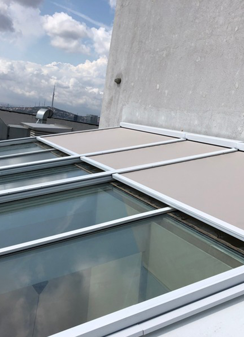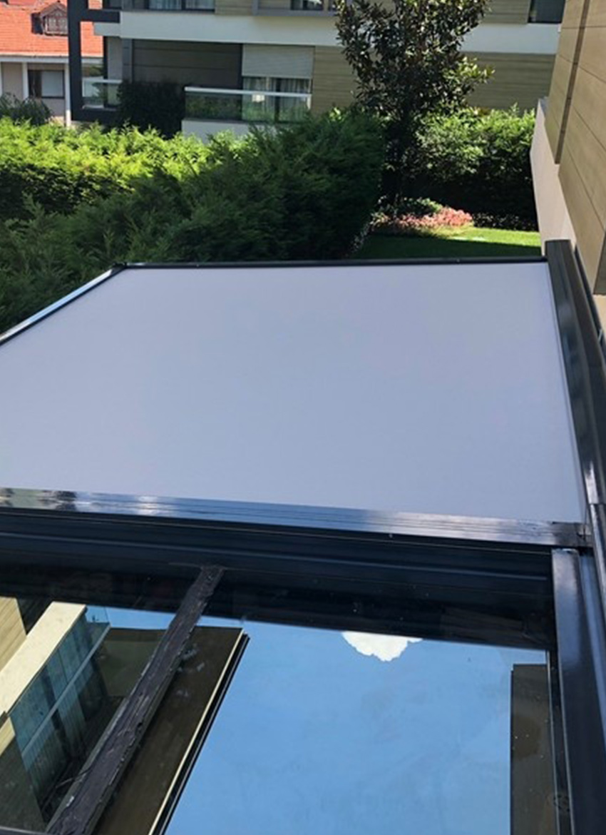 Kullandığımız kumaş yarı geçirgen olabileceği gibi cam tavan üzeri uygulamalarda güneşi tamamen kesebilmek için opak blockout kumaş ta kullanılabilmektedir.
